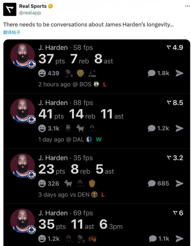 虽然最后未能绝平,但19秒9分的得分爆发力,差点复刻“麦迪时刻”,太吓人了。36岁的哈登似仍然是那个无所不能的双能卫,全场砍下37+7+8,全场制造15个罚球,还是无法阻挡,冲击力十足。很多人认为,这就是腿筋受伤之后,恢复得最好、状态最好版本的哈登,最近四场比赛,他分别砍下35分11篮板6助攻、23分8篮板5助攻、41分14篮板11助攻,37分7篮板8助攻,场均34分9.8板8.8助,还是MVP水准啊!