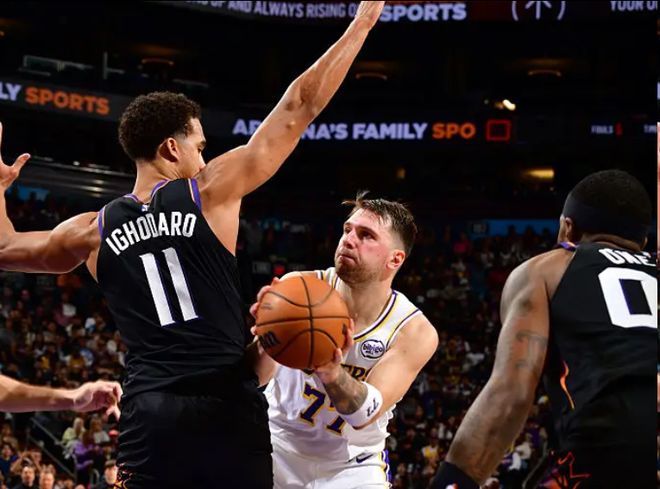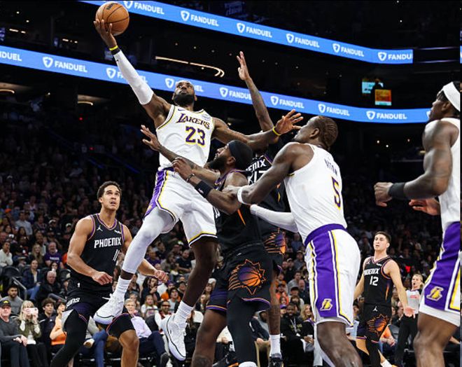 最后4分钟,湖人的得分又陷入停滞,在球队以111-97领先对手的情况下,太阳在布克和狄龙的带领下,利用湖人投篮不中和失误,特别是最后一分多钟,詹姆斯传球失误,狄龙转换到罚球线命中跳投,随后太阳三分又中,球队打出一波12-0的高潮,将分差缩小到109-111。