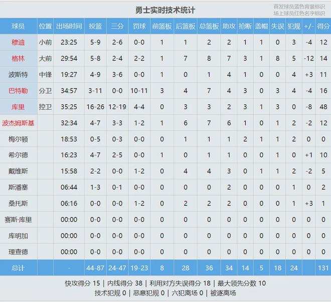库里投篮26中16,三分19中12,罚球4中4,空砍48分3板2助3断1帽,正负值-8。这是库里生涯第一次投进12+三分的情况下,输掉比赛。目前库里生涯已经5次投进12+三分,高居历史第一;克莱三次12+三分,位列历史第二。