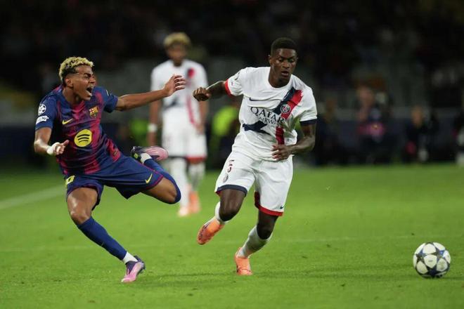 相对而言,压出逼抢、找回欧冠节奏的巴黎,在控球的运用和进攻多样性两个方面都强过了弗利克的巴萨。其中最重要的对决就是左后卫努诺·门德斯单挑亚马尔。尽管门德斯在一次回追中拉拽犯规领到黄牌,但他对亚马尔的限制总体而言相当成功,亚马尔在对方限制干扰下踢法显得很程式化,可预见性很大。实际上在6月份的欧国联决赛中,努诺·门德斯就已经赢得了对亚马尔的单挑。