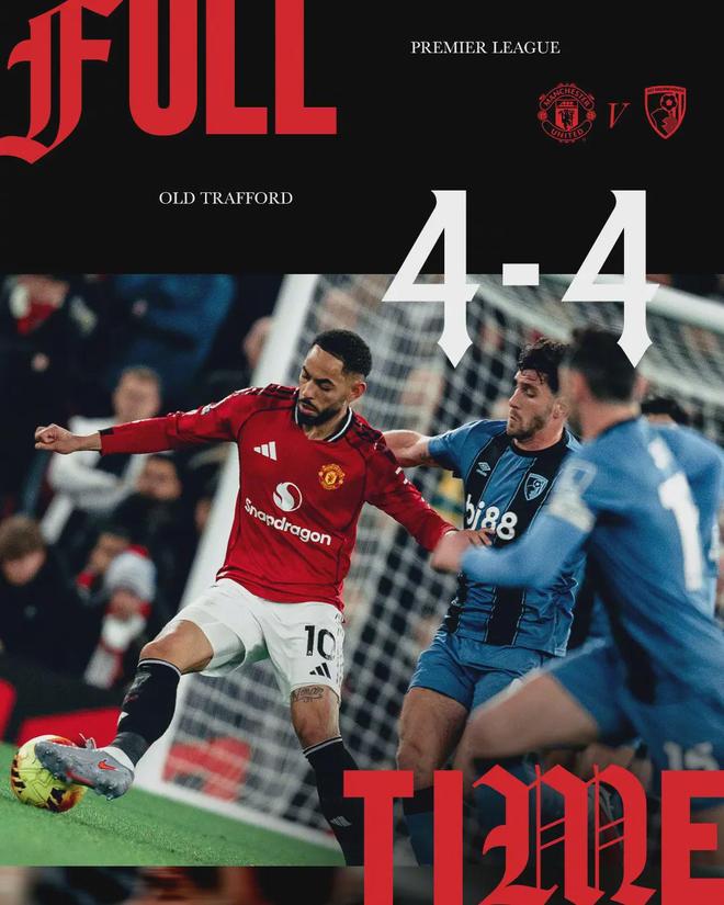 夜幕下的老特拉福德,记分牌上的4-4比分逐渐黯淡。这是曼联自2013年5月以来在英超最高比分的平局,上一次是客场5-5战平西布朗。