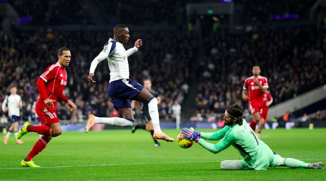 第27分钟,波罗大脚传中,斯彭斯头球摆渡,穆阿尼头球攻门,阿利松稳稳将球没收,这也是热刺本场的第一次射正。