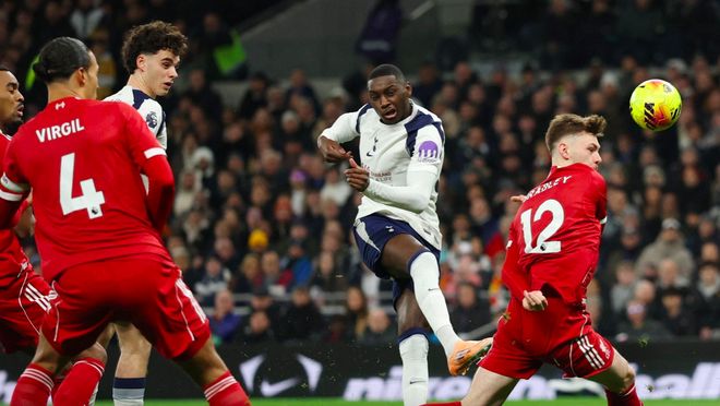 第64分钟,热刺差点扳平比分,穆阿尼的传中越过阿利松的头顶,击中横梁弹了出来。